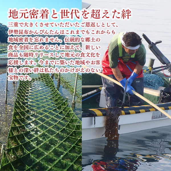 三重で大きくさせていただいたご恩返しとして、伊勢昆布かんぴんたんはこれまでもこれからも地域密着を忘れません。伝統的な郷土の食を全国に広めることに加えて、新しい商品も随時リリースして地元の食文化を応援します。今までに築いた地域やお客様との深い絆は私たちのかけがえのない宝物です。