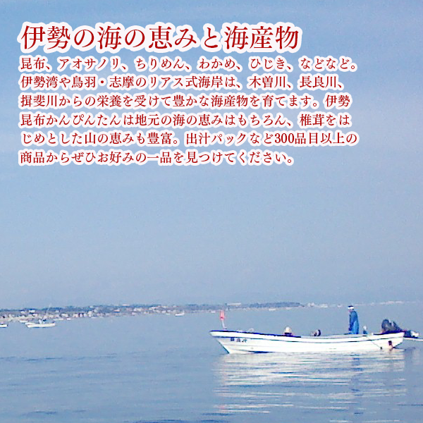 昆布、アオサノリ、ちりめん、わかめ、ひじき、などなど。伊勢湾や鳥羽・志摩のリアス式海岸は、木曽川、長良川、揖斐川からの栄養を受けて豊かな海産物を育てます。伊勢昆布かんぴんたんは地元の海の恵みはもちろん、椎茸をはじめとした山の恵みも豊富。出汁パックなど300品目以上の商品からぜひお好みの一品を見つけてください。