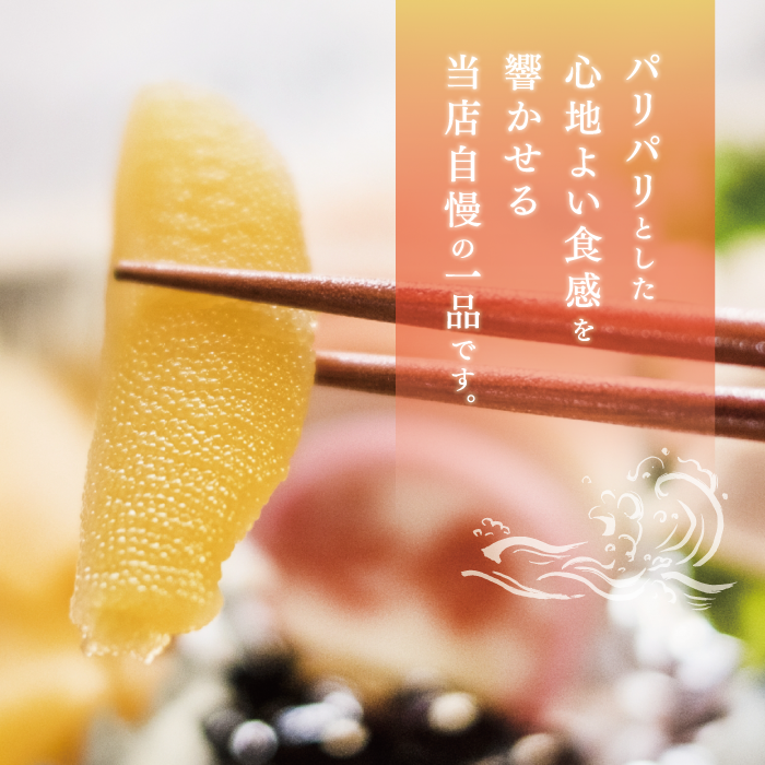 かずの子本来の少し茶色が入った黄金色、艶、本物の歯応え、鼻に抜ける香り、本物を味わってください。